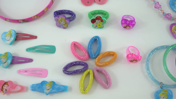 • Quantity: 25Pcs (8x Hair Bands, 4x Bangles, 4x Clic Clacs, 2x Hair Clips, 2x Rings, 2x Necklaces, 1x Alice Band, 1x Hair Brush, 1x Mirror)