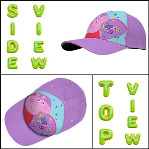 - 1x Purple Baseball Polyester Cap Comes with Peppa-Pig printed on it. It's perfect for keeping Kids shaded and cool during warmer weather.